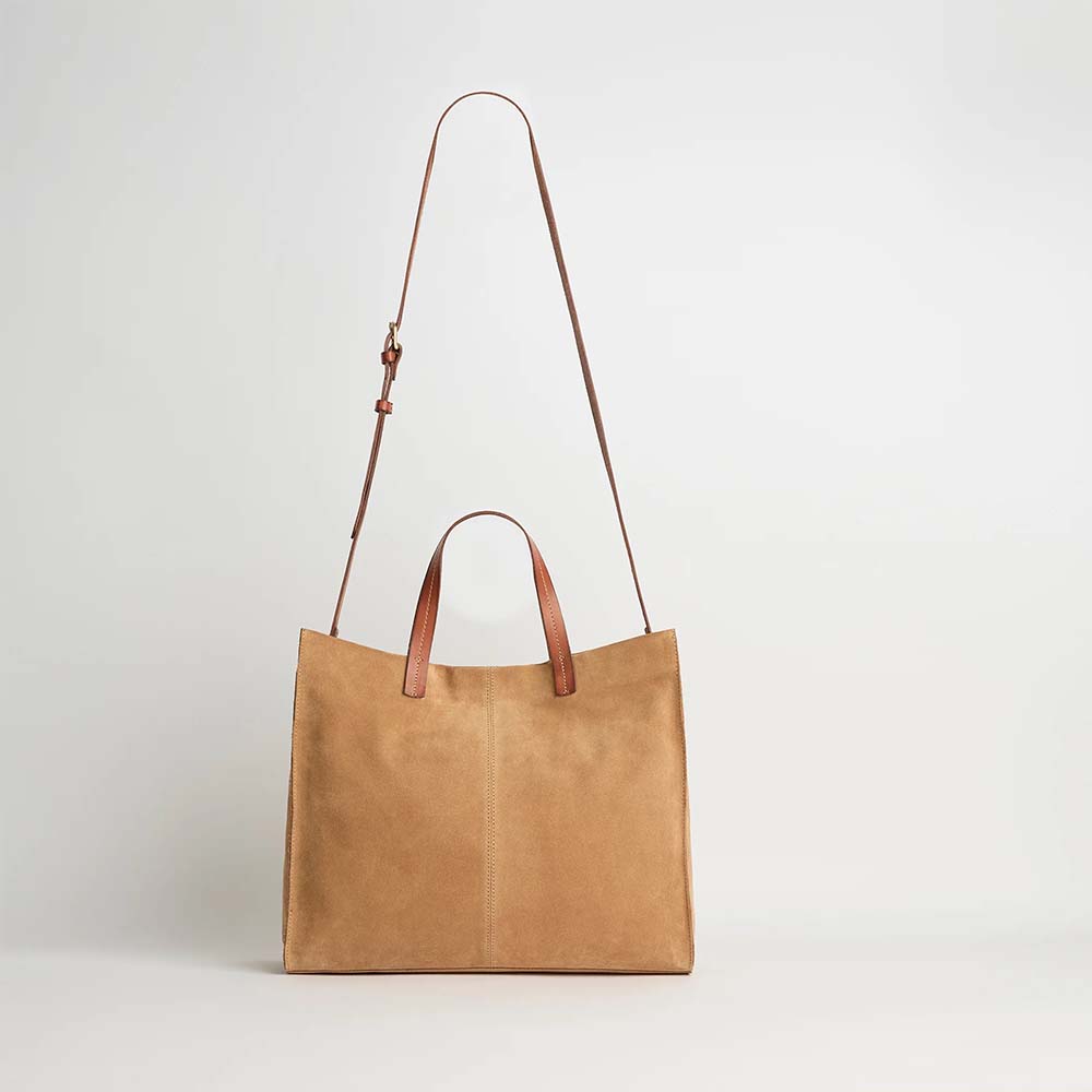 A medium-sized everyday tote crafted from water-repellent suede. Durable and stylish, with Italian leather straps and premium brass hardware.
